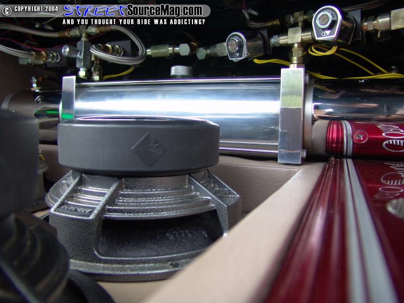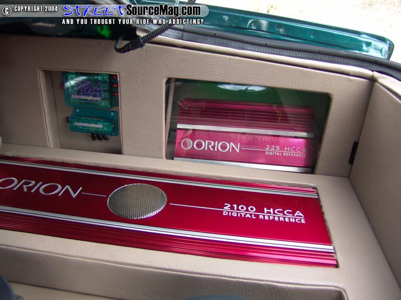 The vocal amp runs a pair Clarion component set up front and a pair of Clarion 6x9’s in the rear deck. The 2100 runs four Rockford Fosgate chrome Punch 10’s. The subs are mounted firing down into a fully sealed fiberglass enclosure. The amps, yellow top Optima for the stereo and Lightening Audio caps are all mounted around the subs. There are a couple Plexiglas windows with green neon behind them for effect lighting. All the trim panels are wrapped in beige leather that matches the interior.