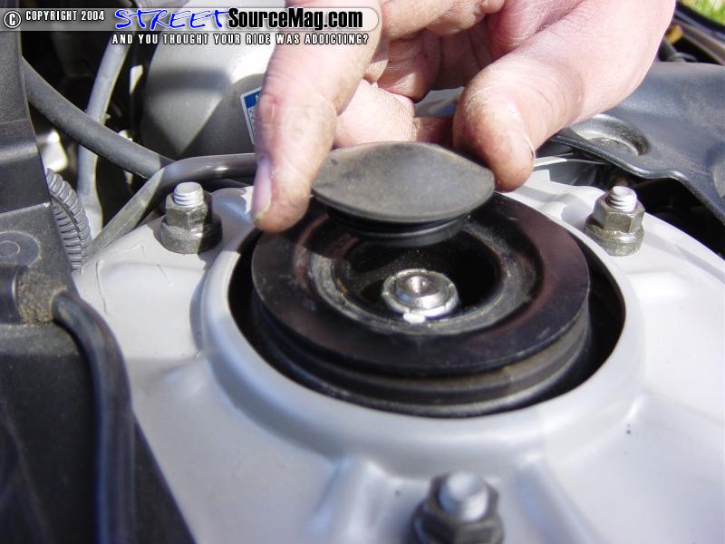 Here is the set of springs I chose for this project. 1.5” Goldlines. After securing the car and loosening the lug nuts, (we started on the front of the car) remove the top center cover from the front struts. Be sure to leave the wheel on the car. Its weight will absorb the spring pressure.