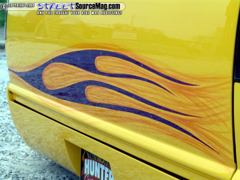 The stock Chevy seats were scraped for a new set of Saturn buckets. The rest of the interior, including the custom-built center console was wrapped in gray tweed and yellow vinyl. Brandon McDonald from Lebanon, Tennessee did most of the interior work. For the final touch, a billet steering wheel and several billet accessories were added.