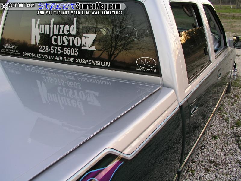 Kevin’s next line of business was to change the appearance of the pig to that of a prize winning swine. He started by adding a Goodmark 3” cowl induction hood. After the entire body was smoothed to perfection Kevin applied several coats of RM-Diamont Green and Silver base coat to the entire truck in a two-tone fashion.   Once the base was dry Kevin wanted to separate the two colors by airbrushing the appearance of a chrome stripe. Last but not least black and blue pinstripe was added for more detail.