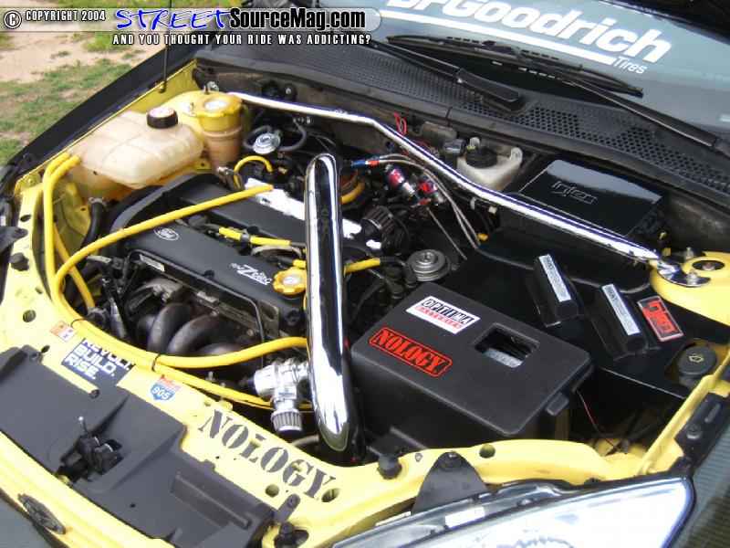 With the word Sport Compact, Freddy would decide to beef up the Focus to ensure his it was really a sporty compact. For starters the installation of a Turbo Performance turbo kit (garret T28 turbo, Blitz blow off valve) would be installed along with a PWR intercooler and radiator. To keep from turbo lag Freddy would then install a Nitrous Express 50 shot fogger nitrous kit, N-Tercooler kit and purge valve with 3 tanks.