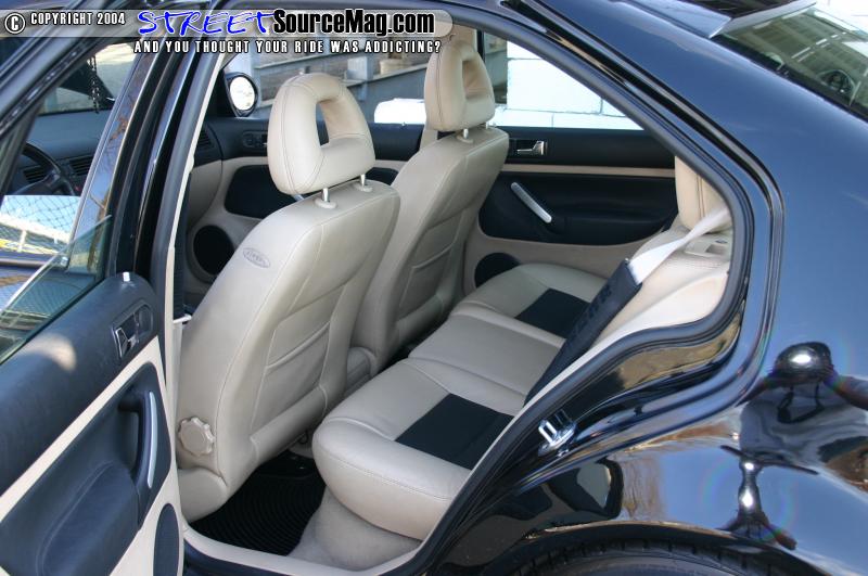 The interior was fitted with an R32 Brushed aluminum dash kit, door handles, Chrome circle rings inside the cluster, Beetle headrests (3 in the rear), custom two-tone black and beige leather seats and door panels, Beetle Turbo S aluminum door lock pins, custom red LEDS inside handles, VW Passat W8 overhead sunroof console, VW 20th. Anniversary black hand-brake boot with silver stitching and a euro headlight switch.