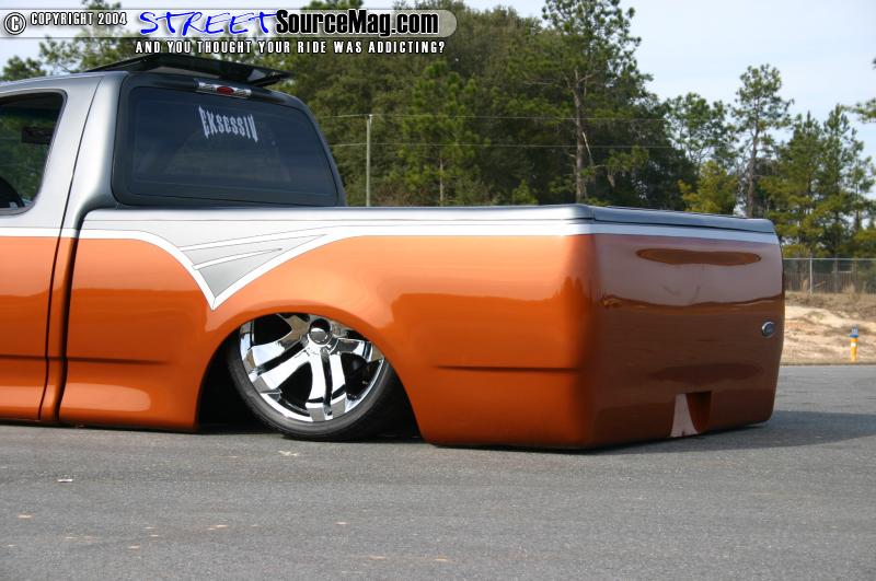 The bed features a clean and smooth setup along with some diamond plate filler panels. A modified front bumper, billet grille, chrome grille shell, and APC lights all set off the front of Joeys 150. Shane Barton then laid down the PPG burnt orange and grey paint job with a silver graphic emphasizing the two colors. The graphic was outlined in black to set it off from the other colors.