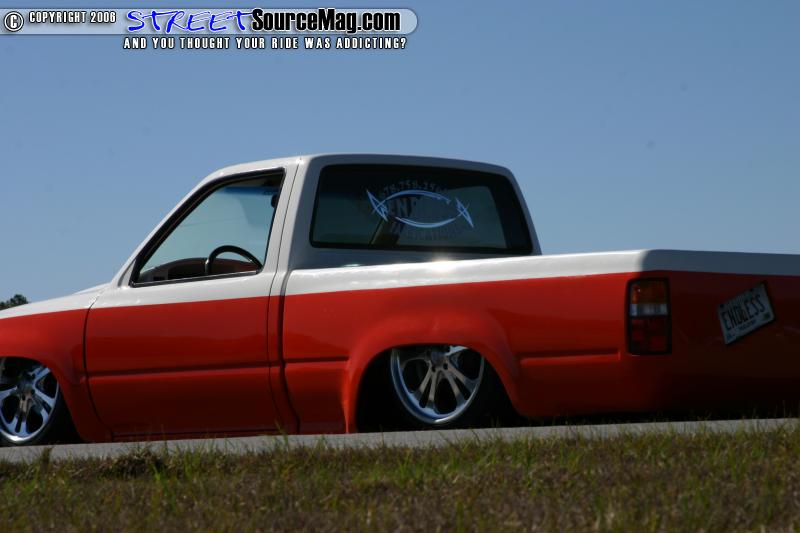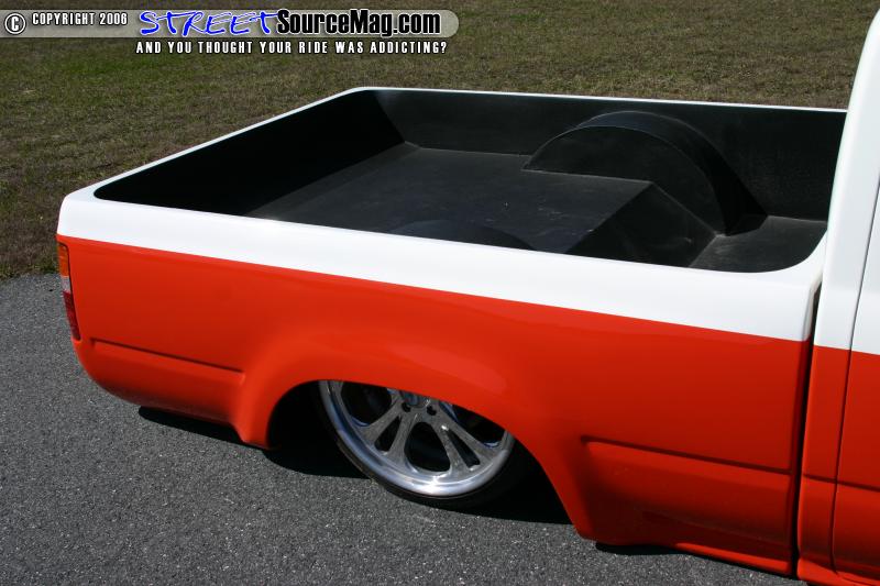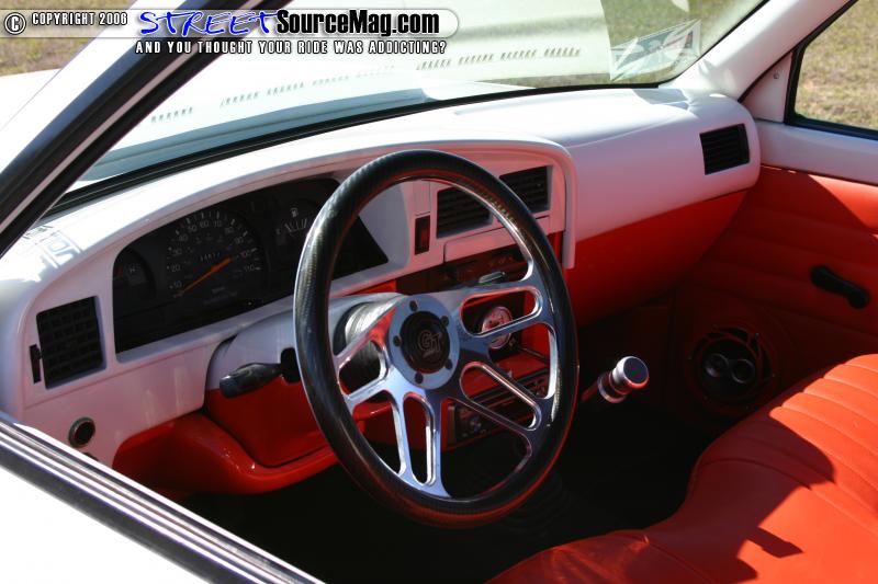 The interior of the truck features a painted dash, wrapped door panels, bench seat wrapped in white and orange, billet steering wheel, and a Pioneer head unit. Gary’s Auto Interiors performed the wrapping.