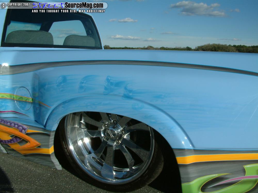 The suspension would then be powder coated gray with a light flake along with the brake drums and dust shields. The front would then be tubbed to allow room for the 18 inch Bonspeed Laguna’s while the rear was tubbed to fit the 20’s. Keeping the frame and body in good shape a 1-inch drag plate on the rear of frame would be welded up.
