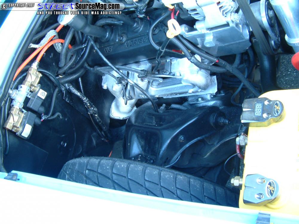 With a V6 power plant already in place many items would be reworked for show purposes. With a Borla muffler and custom pipes in place Donut would add a chrome brake booster and master cylinder. The block would be painted along with all of the engine brackets powder coated to finish things off.