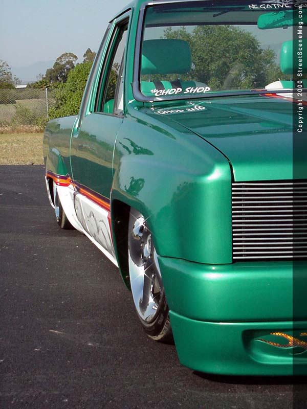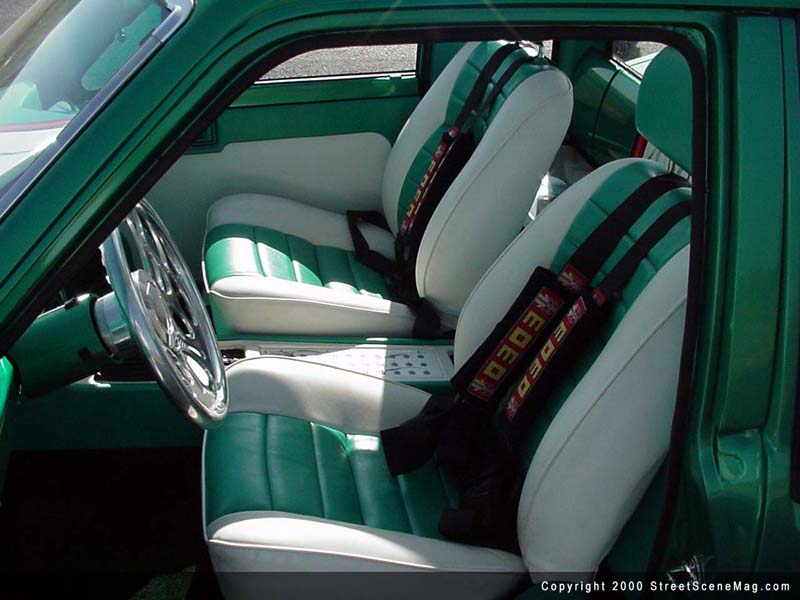 Attached to the new wheel, Nathan also came up with a custom steering column, which features relocated blinker, wiper, and light controls. The new gauges with a tachometer were also relocated. To give the finishing touches, the seats were upholstered in green vinyl with white leather. The dash EQ and amplifiers were all painted with graphics to flow along with the graphics through the Toy. The headliner was also customized with flames. Other notables are a Momo shifter, Momo aluminum pedals, and Momo 4-point racing harness seat belts. To follow up the full custom interior, Nathan went to town on what he does best, the stereo system. The head unit of choice was a Eclipse 5303 am/fm CD player. To keep the music balanced and in tune, he went with a Precision Power DEQ-230 (30 band) EQ. To play the music, Nathan captured a sponsorship by Boston Acoustics and put in a set up 3-way Pro 6.53 separates and 4 10-inch subs. To push his bad ass speakers, Nathan went with 2 Precision Power PC-2600 amps. Monster cables were used throughout the system along with an Optima battery to keep the juice to the amps.