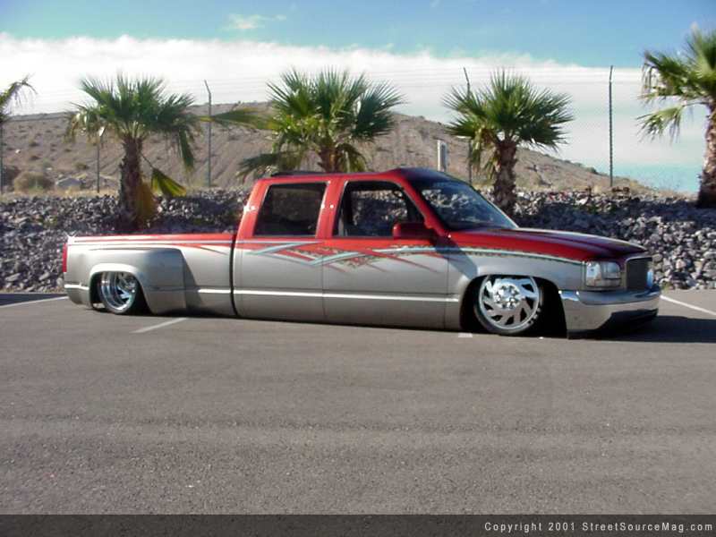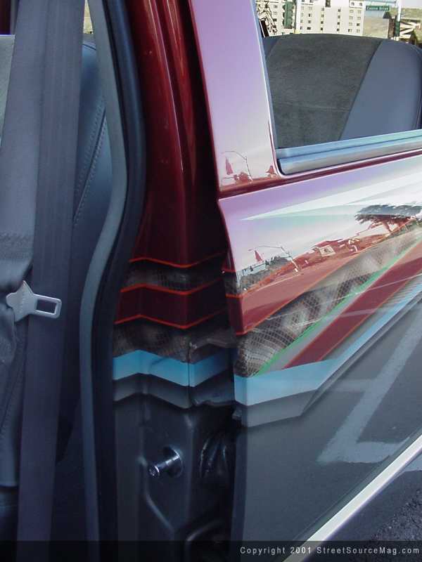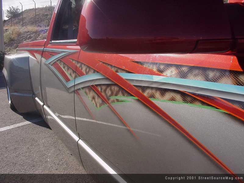With the body smooth, it was left up to the professionals at Pat's Auto body of Houston Texas to prep the body and lay the paint. The conclusion was to give the body a two-tone look with just the right colors. The choice of colors would be Lexus red and Chevy puter. To help break up the two colors, Bill dropped off the Dually with Pat Maxwell of Maxwell Designs of Houston TX. While in Pat's hands he was to lay graphics from front to rear along with throwing graphics throw the dash and center consoles. The attention to detail in Pat's work is something to be desired. | Not missing anything......including jams. |