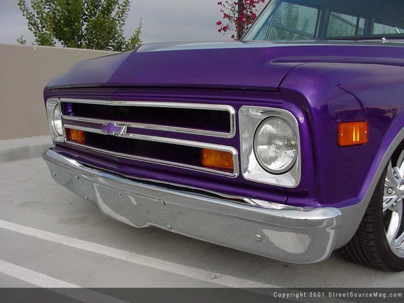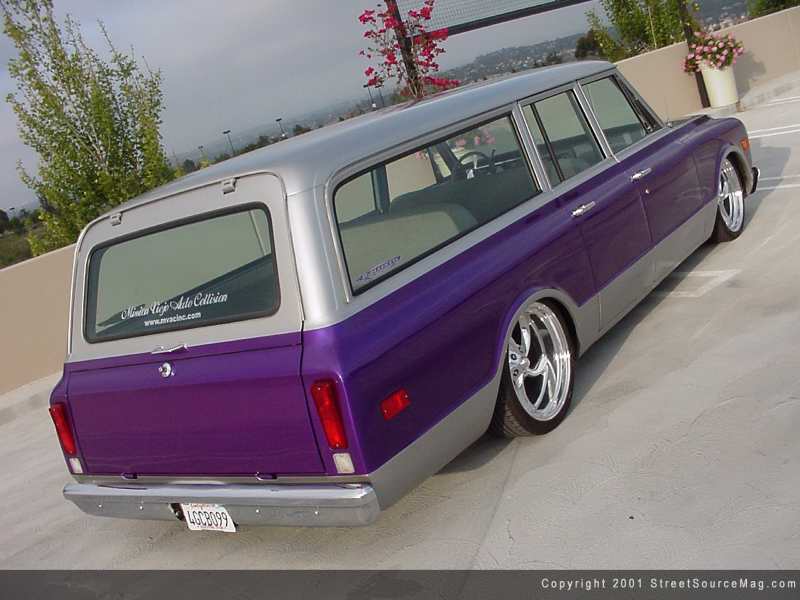 With the materials and knowledge that Mark possesses, the paint would become the first eye-catching element to this clean Suburban. Utilizing PPG paints, Mark decided to go with a two-tone paint job using Porsche silver along with a custom blended purple. After many coats of clear, one can see that time was taken to assure nothing but pure professional work was applied. Mission Viejo Auto Collision is responsible for all of the body and paintwork found on the '69 Suburban.