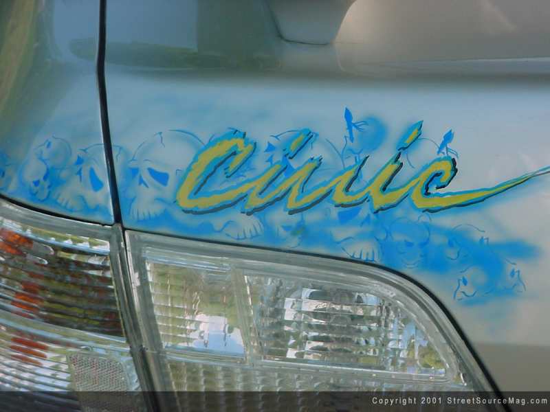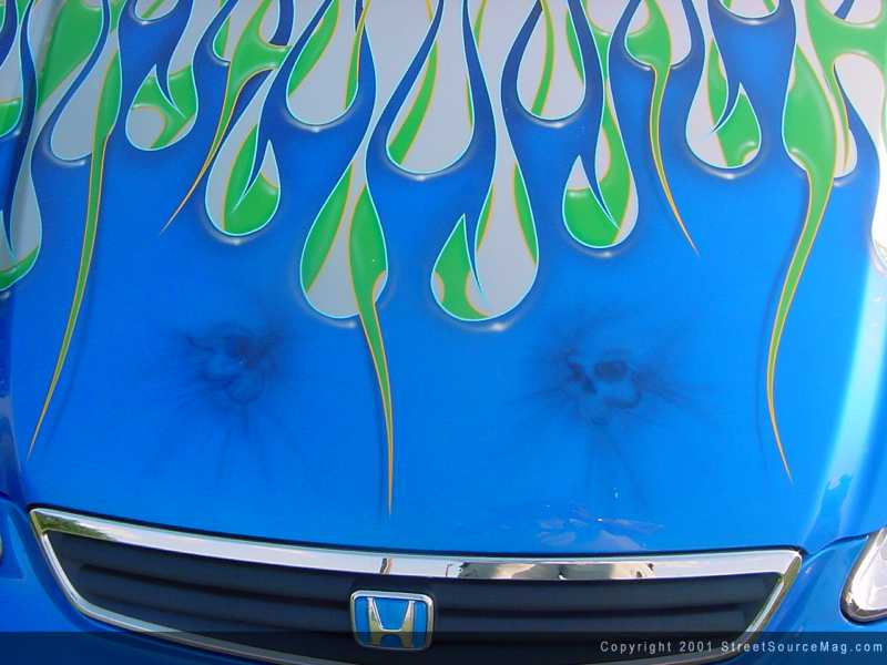 With the car looking completely awesome Doughboy found a way to make it even better by laying down some dope ass airbrushing that was subtle yet sweet and eye-catching something that everybody loves, skulls.  Not only did the master at hand of the airbrush hit perfection on the outside of the car he did it again on the interior. Doughboy did his best to bring the interior up to speed after his great outside work he layed skulls on the dash steering wheel and door speaker covers to make Levi's interior perfect.