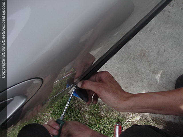 2. Don't worry about being gentle pulling off the moldings, your are shaving them so I doubt you'll be putting them back on anytime soon. With a little force just pull the molding back. This goes the same for the small molding on the front fenders. The plastic fittings holding them in will break off allowing you to pull them off. 3. With the front doors and fender taken care of, repeat on the back door. Get a flat head screwdriver or something flat to help begin pulling the molding back.