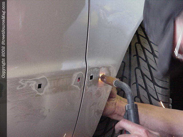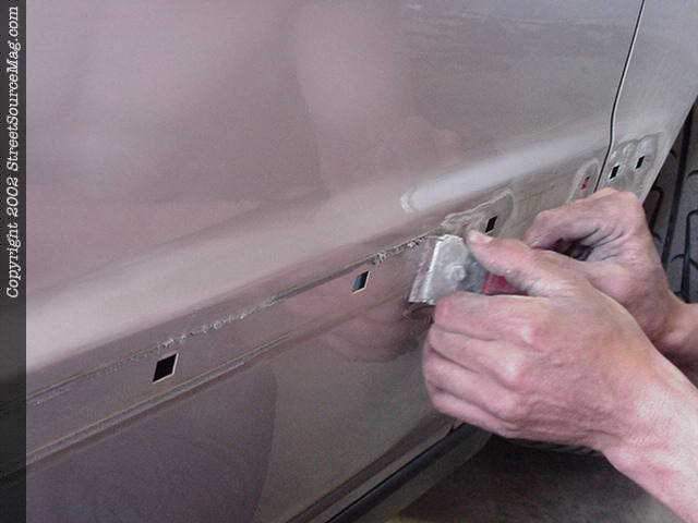 4. Now that the moldings are off it's time to remove access sticky tape and clean them up. 5. You will need to grind each hole complete of paint to allow a good weld to fill in the holes. We recommend removing the door panels before welding. With the door panels off you can then place small pieces of metal behind the holes to be tacked to close the hole. 6. With the doors cleaned up, it is time to tack up the holes. Be sure to let each hole cool off after each tack so that you do not cause the body to warp.