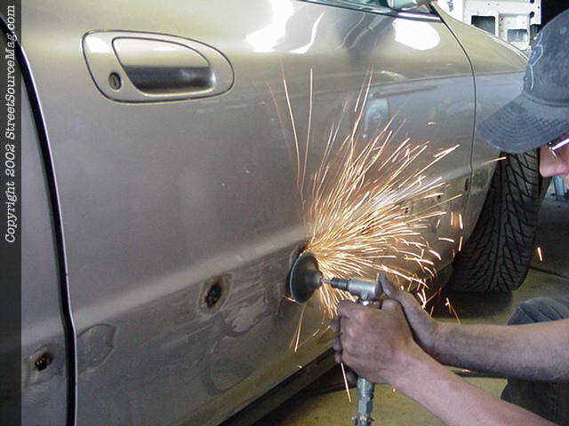 7. After the holes are all tacked up, you will then need to grind down the welds as smooth as possible. If you see any decent size pinholes after grinding you may want to weld them up and grind smooth again. 8. With the grinds smooth, it would then be time to sand down all necessary areas where the moldings were placed with a bit extra top and bottom showing bare metal. 9. After sanded down, spot putty all welded area's filling any low spots to give you a smooth door.