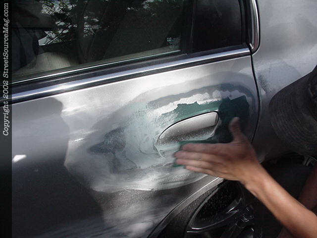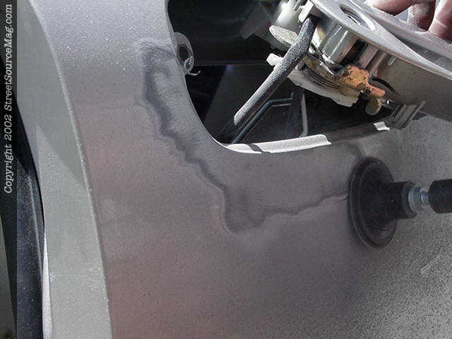 6. Once the door handle is back in place and the ready for the Everglass, you will then need to grind the paint off the door. Make sure and get a good couple of inches around the door handle for an even bond of Everglass. 7. After the Everglass is applied, then sand down smooth and glaze over it with spot putty to take away any low spots in the work.