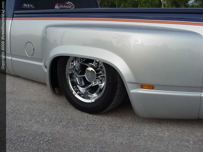 The new mods gave Nelson's dually a new look, but KUSTOMWERKS was not quite finished. Next, they shaved the door handles and the antenna and installed a Precision bumper and phantom grille shell.  The factory hood was removed and a steel cowl induction hood now resides in its location. To allow the hot Tennessee sunshine into the cab, KUSTOMWERKS installed a massive 40"x55" Street Beat sliding ragtop. The body mods were complete and the truck was prepped and ready for paint.