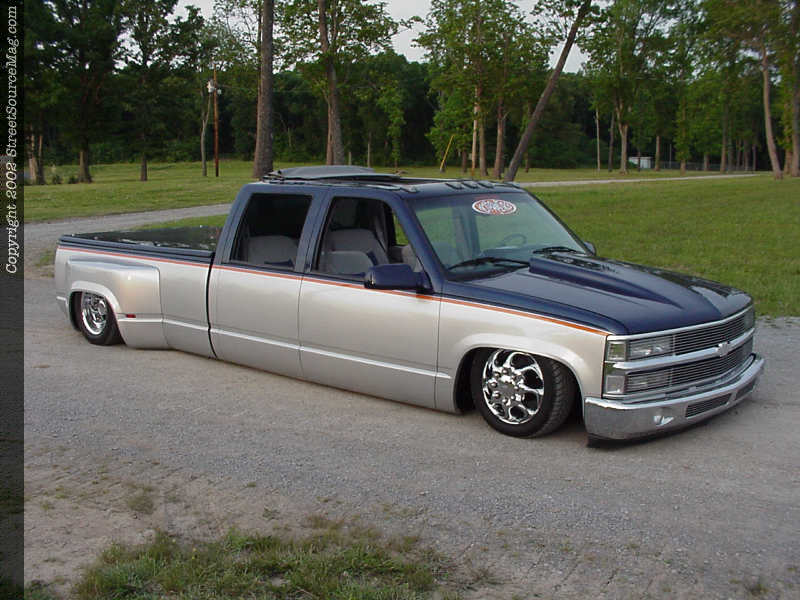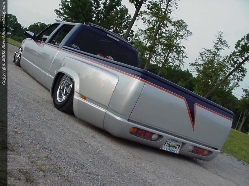 Mayo's Body Shop in South Fulton, Tennessee was called upon to give Nelson's beast life. The crew at Mayo's two-toned the dually using Ford Frost Silver and Indigo Blue, then separated the two color with a small, but subtle graphic using House Of Kolor Tangelo Orange.   The truck was then cleared and sanded to a bright, glossy shine.