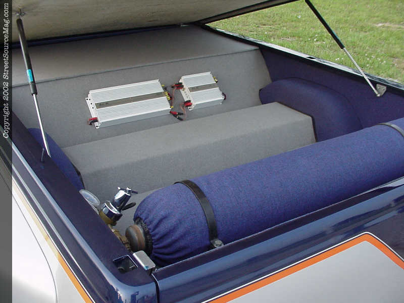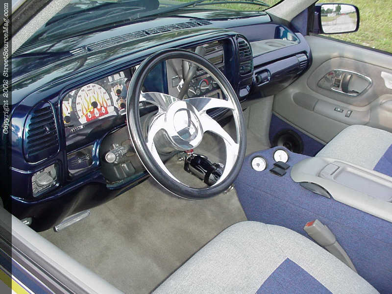 A special center console, complete with molded gauge pod was also wrapped utilizing nordic blue tweed. You will also find billet dash inserts and pedals from Trenz, as well as a Billet Specialties steering wheel.