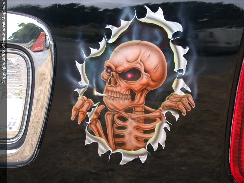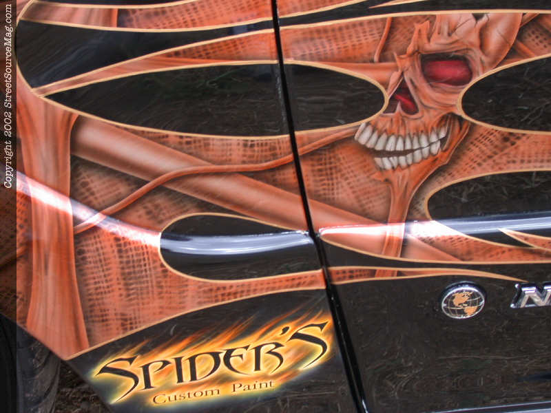 Through out the copper colored flames you can find numerous amounts of airbrush work with skulls and many other eye-catching items. To help bring out the tribal work, Spiders decided to out line the work with yellow pin stripping.