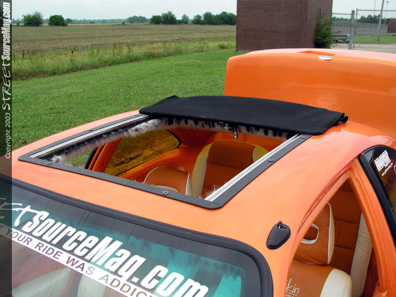 Luke went over the entire car multiple times wet sanding and re-priming the car until it was in mint condition. With the body now ready to accept it's new hue Luke and the crew laid down generous coats of Lamborghini Orange from PPG. Once the body was dry projector headlights were installed into the front clip. In true mini trucker fashion Luke installed a StreetBeat sliding ragtop into the skyline of the Civic.