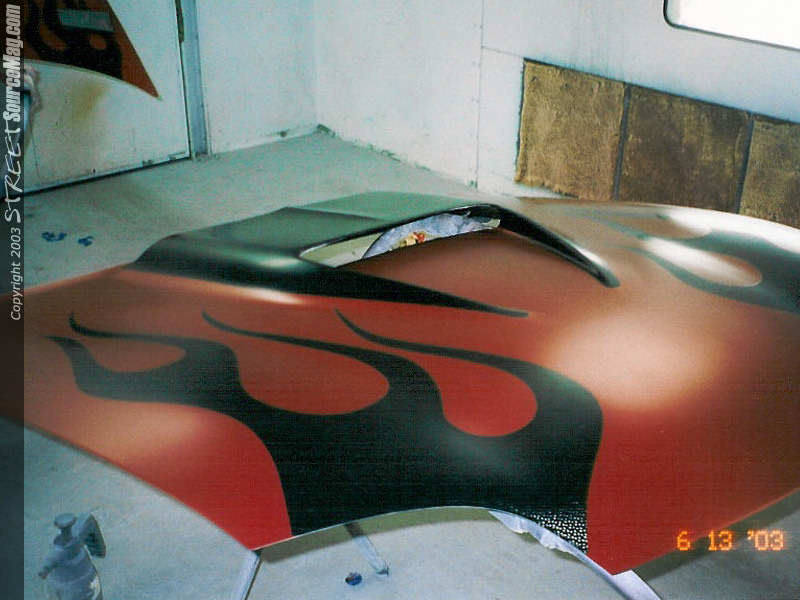 Here you can see the door jambs painted. No color change is complete without doing the jambs. Trunk area jambed in. Porkshops immaculate creation getting sprayed by James "jimmy shine" Houser.