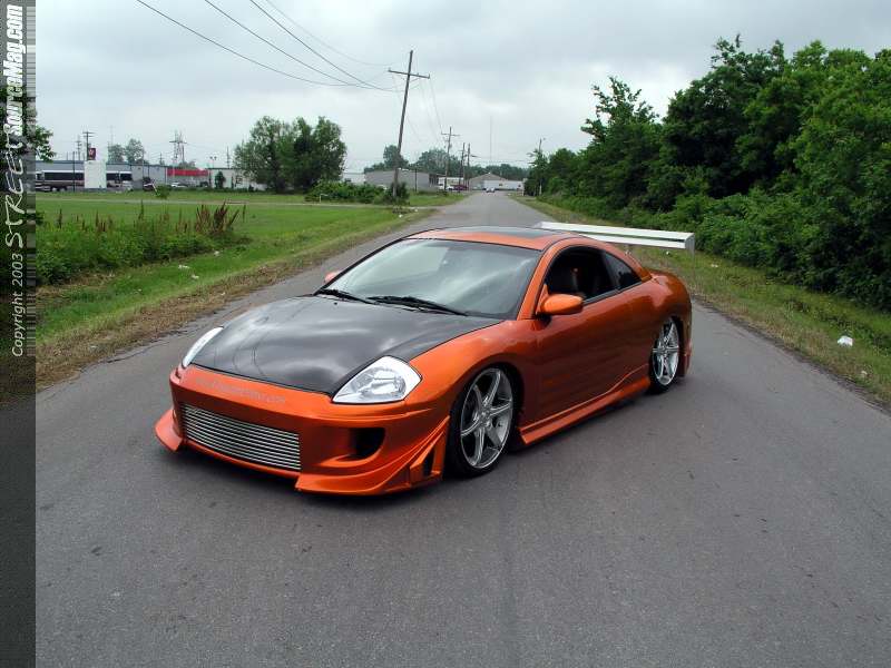 The next item to grace the Eclipse was a new carbon fiber hood and a custom one off grill. An aluminum wing was then added to the rear deck lid to apply the down force needed to keep the Eclipse firmly on the tarmac, and to look good too. Now that the body was in order it was time for an altitude adjustment to the Eclipse. Jay called and ordered a set or strut bags for the front and a set of Firestone 2500's for the rear. Once the adjustable were installed a Viar 450 was called upon to supply the needed pressure the system needed to get the car off the ground.  A three-gallon storage unit was properly hidden out of sight in the wheel well and (4) ½" Parker gold Valves were plumbed with ½" line to get the pressure to its proper place. With the suspension now in order Jay ordered a set of Konig Verdicts in the form of a 19X7 shod with 225/35/19 shoes from Yokohama Parada's.