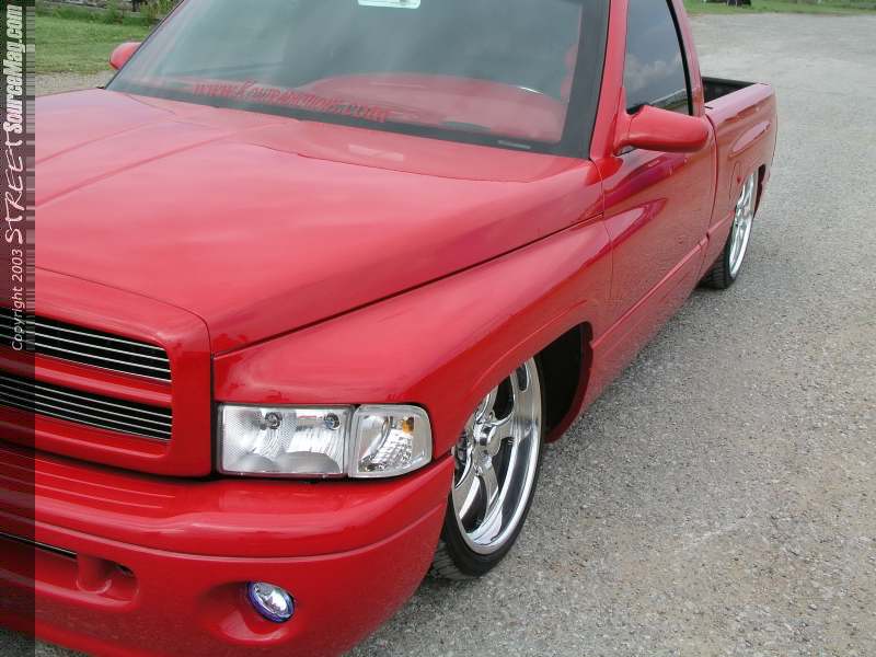 Matthew liked the clean design off the factory Dodge Ram Sport front bumper valance and grill combo, so after a quick stop at the local Ram dealership the new items were ready for Mike to add to the Ram. Matt prepped the truck for several heavy doses of 2000 Dodge Flame Red. Once Matt had the Ram looking it's best a billet Trendz insert was added to the grill and front valence areas.