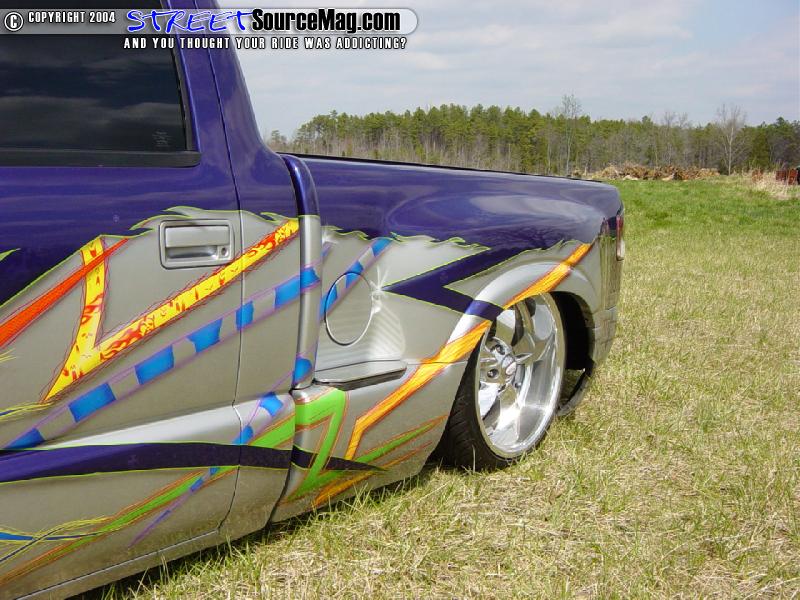 While the interior was stripped out to allow the graphics to be ran into the doorjambs, Nathan took this time to get the interior up to par with the new paint job. Most of the interior panels were wrapped in purple tweed and tan vinyl.  The stock seats were thrown out for a new set of Oldsmobile Brevada buckets. The door panels, headliner and seats all had flames sculpted into them before the material was put on.