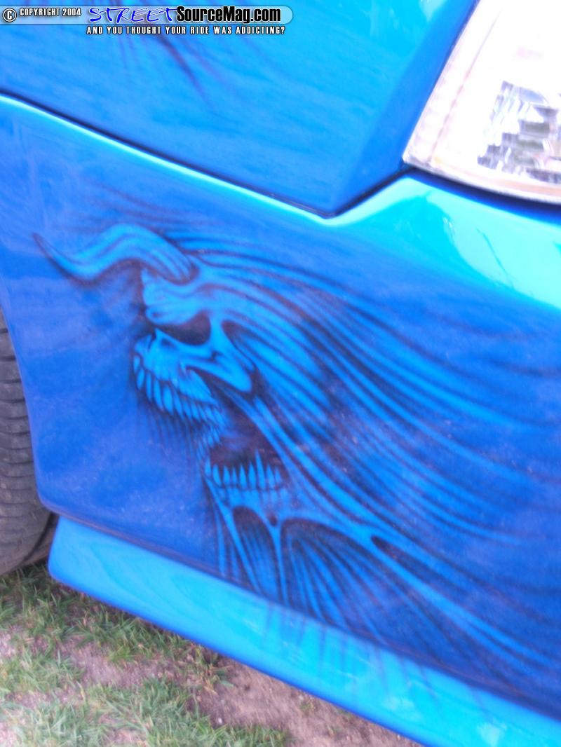 From a distance, as Brooke cruises this drop-top Mustang down the strip, the only thing you notice the wheels, twenty inch D’Vinci wheels wrapped in 255-35-20 rubbers. As the car draws closer the next thing you notice besides the thumping stereo is the paint but it isn’t until it is completely next to you that you notice the wicked airbrushing that covers Brooke’s Stang from head to toe.