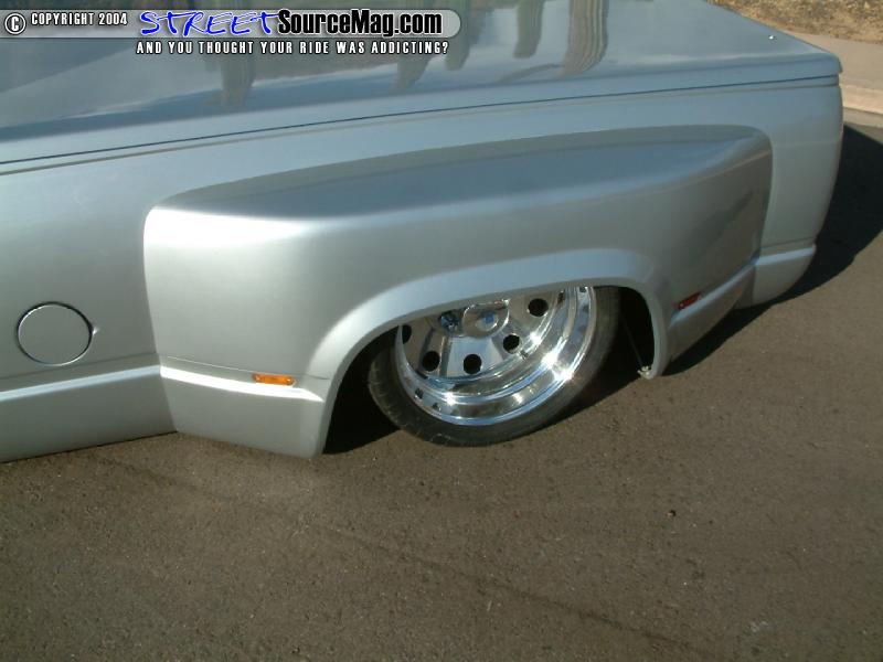 Four FABCO air valves would be used to push the air into the bags while 2 VIAIR 400’s keep the air tanks full and ready for use. With the frame laying out flat it was time for Kevin to apply a 3-3/4 inch body drop to lay the rockers flat on the asphalt and help tuck the 19-inch Alcoa wheel custom made to fit the Dually.