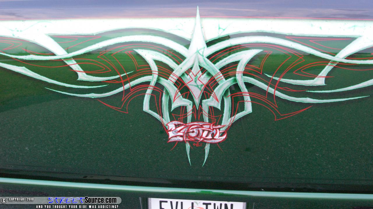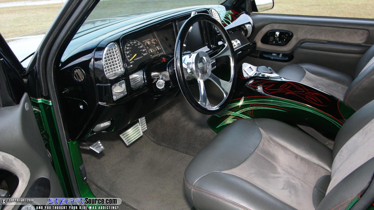 Although this truck has always been easily recognized by its smooth body and unique green and black two tone paint scheme, it too was showing its age. One of the doors and the inner bed floor began to have serious cracks in the body filler, along with other blemishes from use over time. Although it hurt to tear into such a nice paint scheme, Mellon stripped the door and redid all of the metalwork to both straighten and greatly reduce the amount of filler in the door. Moving along to the bed floor, Mellon began finding other areas that needed attention as well. But beyond the body and suspension work, the interior on the truck remained immaculate. The dash and door panels are still remnants of the original “Evil Twin” paint scheme while the other interior panels were wrapped in medium graphite leather and suede by Mike Sutton in Long Beach, California. Even more impressive is the ground-pounding system installed b y Ghetto Bob at 702 Motoring. The custom fiberglass box and floating center console house four 10” Orion subs while the custom fiberglass amp rack houses the Orion amplifiers. Two HE800 Kinetik Audio Powercells provide the juice to keep this system pounding.