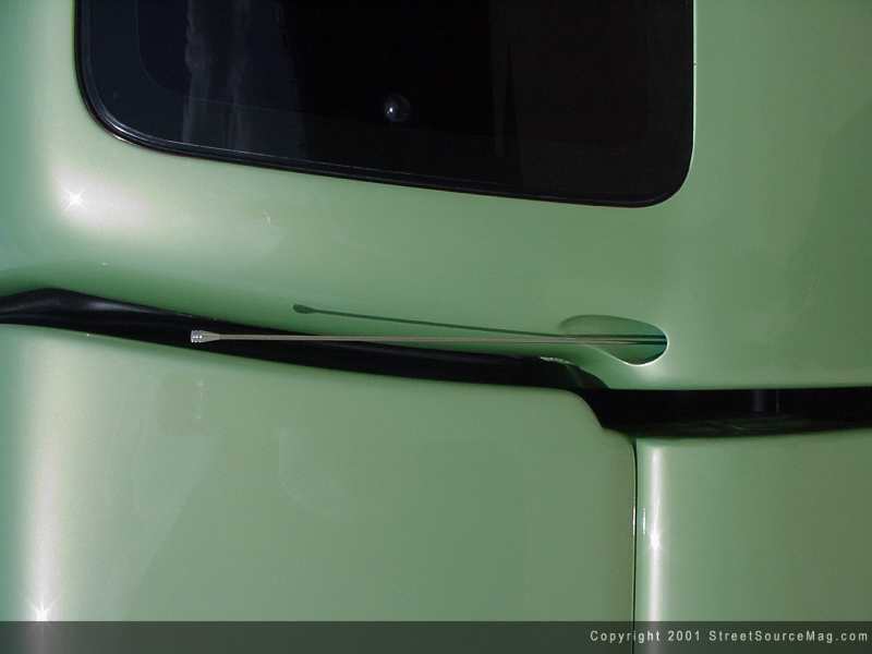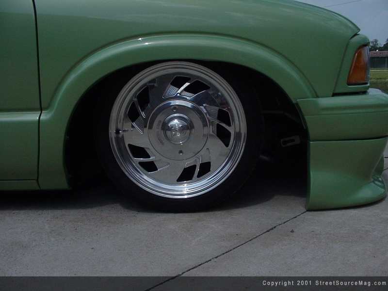 TJ picked up a set up '98 Chevy Blazer power bucket seats and had them recovered in light grey and slate grey tweed. The headliner, complete with biohazard symbol, was wrapped in slate grey tweed also. Everything that could be removed was wrapped in either slate grey or light grey tweed. Billet goodies here and there give TJ's interior accents. Wilbanks Auto Trim was responsible for all interior work performed on TJ's Sonoma.