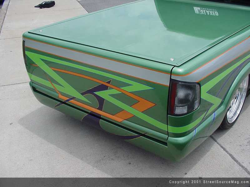 Brandon McDonald grew up around customized vehicles. In 1980, his father bought a ’38 Chevy and began customizing it. Having grown up around this, Brandon decided about 6 years ago to follow in the same footsteps and build something of his own. Brandon knew he wanted his ride to be a little different, and $25,000 later, he has accomplished just that. Starting with a 1994 GMC Sonoma extended cab pickup, Brandon quickly began the modifications. First things first, the suspension had to be set at a level that would be pleasing to the eye. Up front, Brandon installed Bell Tech drop spindles and a set of Firestone airbags. In the rear, the main leaf spring was removed and another pair of Firestone airbags were installed. A custom chrome notch was put in place for added travel. Keeping it smooth was a must, so Brandon installed Gabriel air shocks all the way around. For an added bonus, a chrome 3 gallon air tank provides a place to hold the available air. Jason Bullock of White House, Tennessee and the owner are responsible for all suspension work. Brandon next moved to the exterior of his Sonoma. Again, he called on Bullock to help him out with this task.Bullock started by smoothing the Sonoma front to rear. He shaved the tailgate handle, antenna and 3rd brake light.