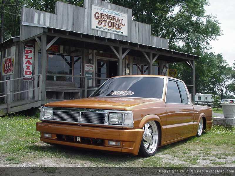 Chris first contacted Eric at Kustomwerks in Union City, Tennessee for a little altitude adjustment. Eric and his partner is crime, Strip, went to work. In the back, a Ford Courier rear-end was utilized along with a Pete And Jakes 4-link to create a cantilever-style rear end with the Firestone airbags actually mounted on top of the 4-link. Custom tubing was cut and welded in throughout, this gave Chris’s Mazda a truly one-off look. Up front, lowered control arms with yet another one-off setup was created, with the bag being mounted on top of the upper control arms. Kustomwerks also built a custom sway bar for Chris’s Mazda. To make things look nice and pretty, all original welds were smoothed and braided brake lines were added. To get Chris’s Mazda off the ground quickly, Kustomwerks installed their very own fast bag valves. With the suspension the way Chris wanted it, he decided body mods and new paint were in order to keep the ball rolling. A new smooth look was in order to give Chris the look he was striving for. Any and everything was shaved. The bumper holes were filled in to start with. Next, the wiper cowl, emblems, mirrors, door handles, gas door, bed seams, and tailgate handle. A steel roll pan was molded in and the tailgate was completely closed. Several people were responsible for Chris’s body mods, including Jeff Pfifer, Shane Wickham and Eric at Kustomwerks.