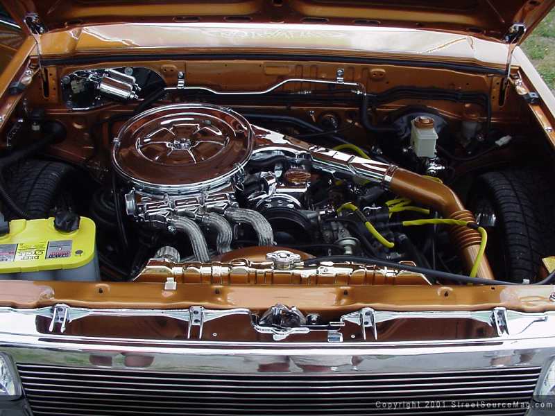 Anyone who attends shows knows that interior is a must if you want to win. Chris knew that and acted accordingly. Tommy at C&C Auto Upholstery was contacted to change Chris’s truck from stock to show. Tommy covered the dash, floor, seats, walls and shifter in toast tweed. Then, Shane Peacock was called in to cover the door panels and gauge pod in the same tweed. A Billet Specialties Indy steering wheel with burlwood wrap was bolted in along with a Momo wood-grain shifter. Chris also installed racing pedals with burlwood accents. Finishing it off, white face airbag gauges were installed. Under the hood, Chris continued his for show-look with an engine that’s so clean, you could eat breakfast off of it. Rodney at Memphis Plating Works was called upon to help Chris with the new task at hand. Anything and everything was chromed or polished including the radiator, valve cover, breather, heat shield, master cylinder, and hood hinges. Vitek wires were installed and lots of black wire loom helps clean up Chris’s engine. To help the engine breathe, 2 ½” stainless steel exhaust tubing was installed with a Borla muffler.
