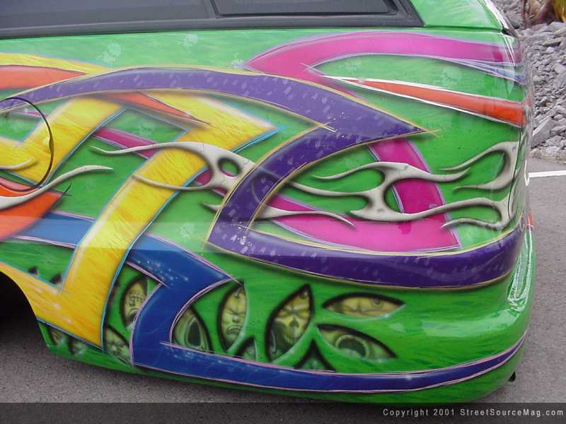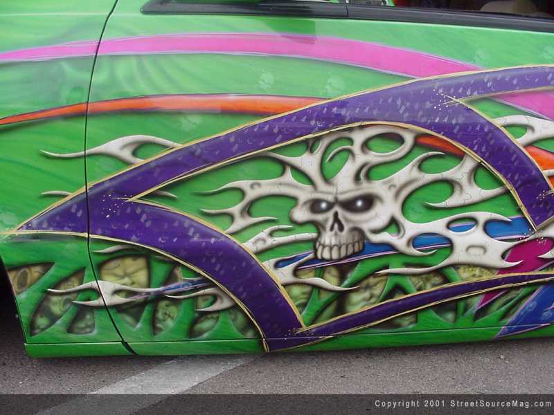 Not done yet, Max would then apply many different airbrushed skulls and what not bringing the entire paint job together. Maxed out Paintwurx, which is Max's business, is responsible for all of the body and paint applied to this eye-popping monster.