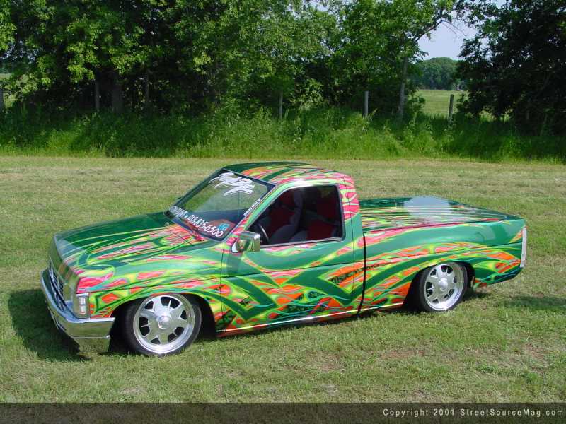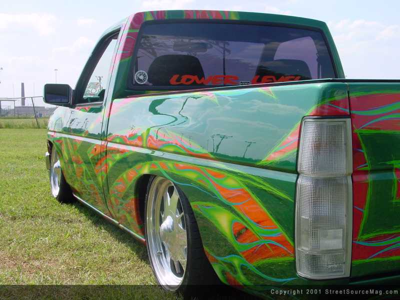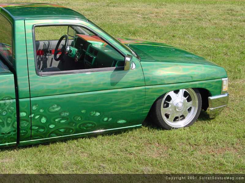 I think Todd's email address says it all in regards to his Nissan truck. Baddass91Nissan is Todd's address and need I say more? Todd and his dad, Todd, made this truck what it is today. The Nissan is extremely modified from bumper to roll pan. At first glance you see the antenna is shaved along with the doors, hood squirters and emblems. The gas door was removed and relocated into the bed. The stock fenders were chunked for the 4x4 variety along with a Toyota 4x4 front bumper.