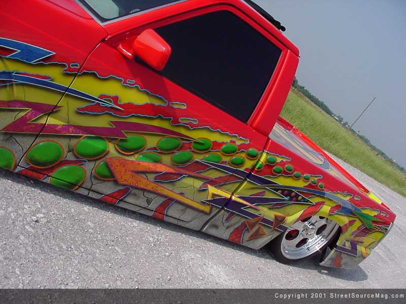 You see, Lance gives his buddy Ty full credit for what you see before you. Anyone who's in the show scene knows some of the history of this truck. But that doesn't take away from what's so special about it. This truck is just as special to the scene today as it was several years ago when it began its creation. Starting out, this 1989 Mazda B2000 had to be set to a comfortable level. In order to do this, a 2 ½ inch body drop was performed, lowering the body down over the frame rails quite nicely. In order to lift the truck from it's laid out state, Firestone airbags were installed at all four corners, utilizing large 3/8" line and fast electric valves in the 3/8" variety. In the rear, a custom c-notch and 4-link allow the Mazda to lay completely out.