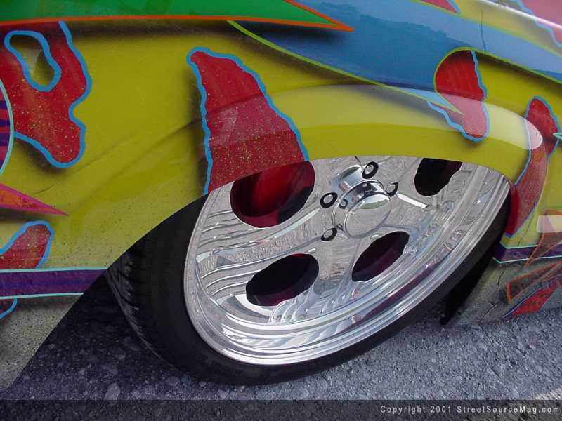 To keep people shaking their heads from show to show, large wheels were a necessity. With that in mind, the folks at Nitro were contacted. Up front, Nitro Hollywood in the 18" variety were installed wrapped in 225-25-18 rubber. Out back,, large Nitro Hollywood 20"s were installed, with 245-35-20 rubber wrapped around them.