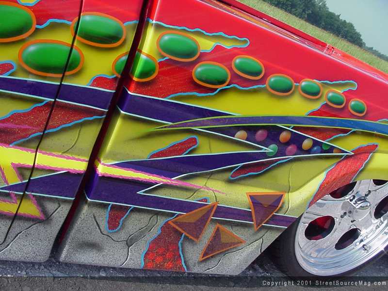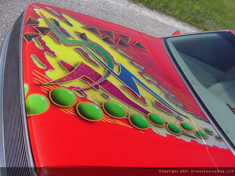 Many different designs were laid down across the hood and panels of this Mazda, carrying over the to rear custom speaker box enclosure.   After finishing up the Mazda with a ton of PPG pinstripe colors, Randall laid down enough clear to make the Mazda look like glass. The outcome was spectacular.