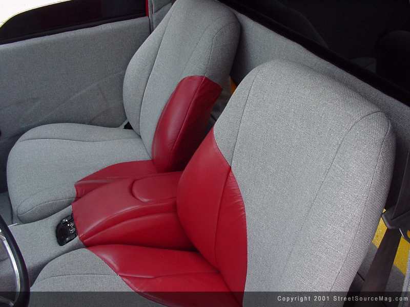 The interior of Lance's Mazda was the next step in the host of mods. Lance himself took this task in his own hands and utilizing gray tweed and red leather, wrapped the dash and door panels, along with a custom headliner.