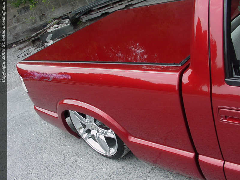 With the body now at a satisfying stage in the game, John dropped his transforming S-10 off to Bud Davis of Davidsonville, MD. While in Bud's hands, the final prep work would be done before laying down the Dupont chrome base Inferno Red paint. Once laid out, Bud would then start laying down 4 different layers of Ghost flames that can be found through out the exterior in shades of purple, blue and silver.