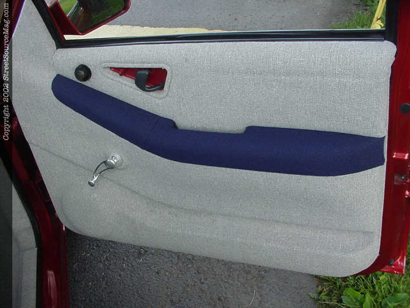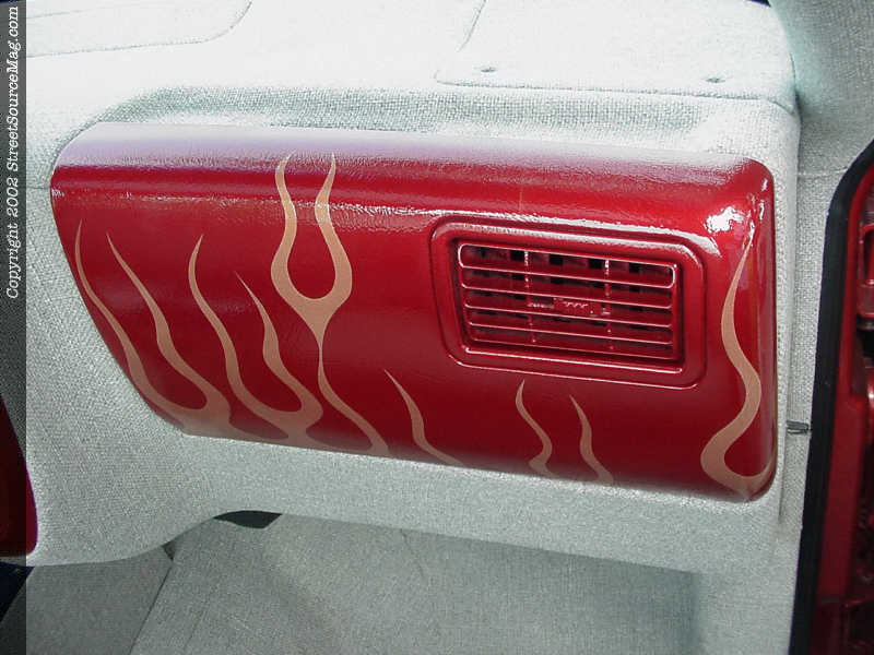 Being around friends that know a thing or two about show rides, John grew to the scene knowing that heads wouldn't turn till the interior was complete. Keeping this in mind, John himself took on the task of wrapping every panel possible. Utilizing gray and blue tweed through out the interior along with color-matched paint from the exterior, John would cover the dash, door panels and anything else imaginable.