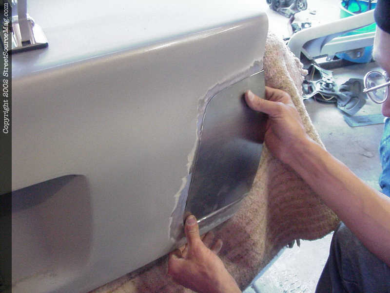 4. Helping to get the correct curve in the bodyline, John put to inch and a ½ slits to get the upper corner to bend correctly before starting his welds. 5. Happy with the fillers, it is time to start tacking to sheet metal into place. 6. The bottom of the filler didn't quit won't to roll as we liked so it was pulled out with a set of pliers and then tacked into place as liked.