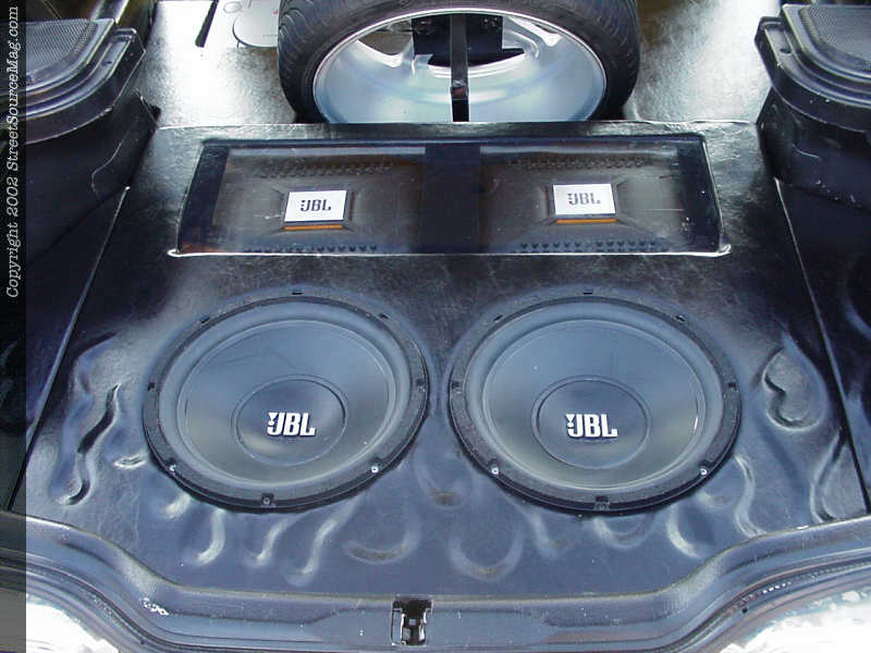 Starting with a Sony CDA760x in dash pushing sound to a set of Infinity 6 ½ in doors and JBL 6 ½'s in rear. To help keep up with the mids and highs, a pair of JBL GT12's would be installed. Keeping the current flowing through out would be a JBL 80.4 and JBL 600.1 amplifiers.   Not yet complete, the 6-inch Panasonic monitor in place of the rearview mirror would need some viewing. Bringing movies and what not to the screen would be the use of a VCR along with a Playstation 1 and 2.