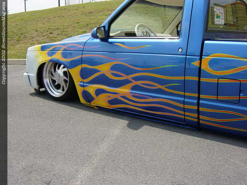 For now, Chris uses Boyd billet wheels as his rolling attire. The 17x8's are wrapped in BFGoodrich 205-40-17 Euro T/A rubber. The engine in Chris's S-10 remains mostly stock, with the addition of a few aftermarket products including an air intake and steel braided hoses. This mostly untouched part of the truck will soon be full show, as Chris already has made plans to swap the stock 2.5L with a monster 350, complete with tons of billet.