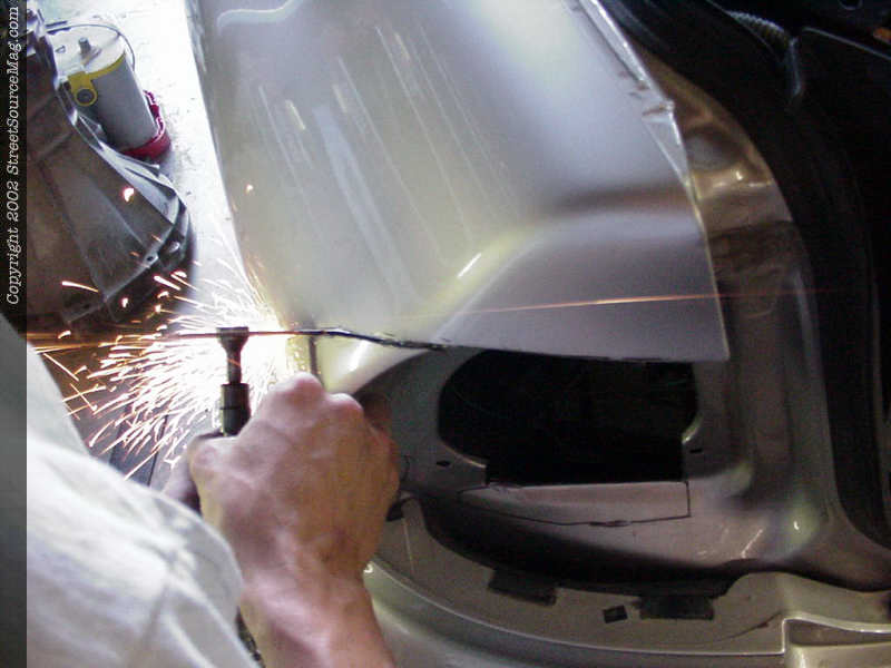 3. Once everything was measured out we took the hacksaw into the inner light box since we were not worried about bending up a straight panel. Once we hit the outside a dye grinder was used to cut the stock Honda metal.