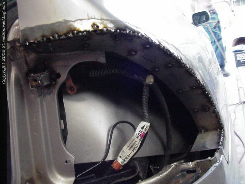 4. Once everything was cut out the next step was to clean up the cut and grind away the paint preparing for welding. Once cleaned up John then built some inner pods that would be welded in making a cup for the taillights to sit in along with strengthening the quarter panel.