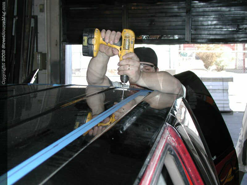 Next, the frame is outlined in masking tape so that the pencil will show up when he outlines the opening. Make sure that you measure twice and only cut once. This is critical when cutting a large hole in your roof. A pilot hole must be drilled in order to insert the electric sheers that will cut the rest of the roof opening.
