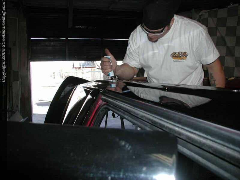 After test fitting the frame, John trims a few areas for a nice snug fit. With the frame now in its proper place, the holes needed to be drilled to securely mount it in place. The frame is then pulled back off and a bead of silicone is ran around the perimeter, ensuring a proper seal.