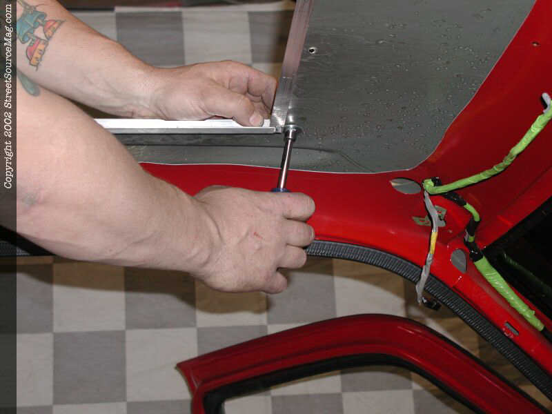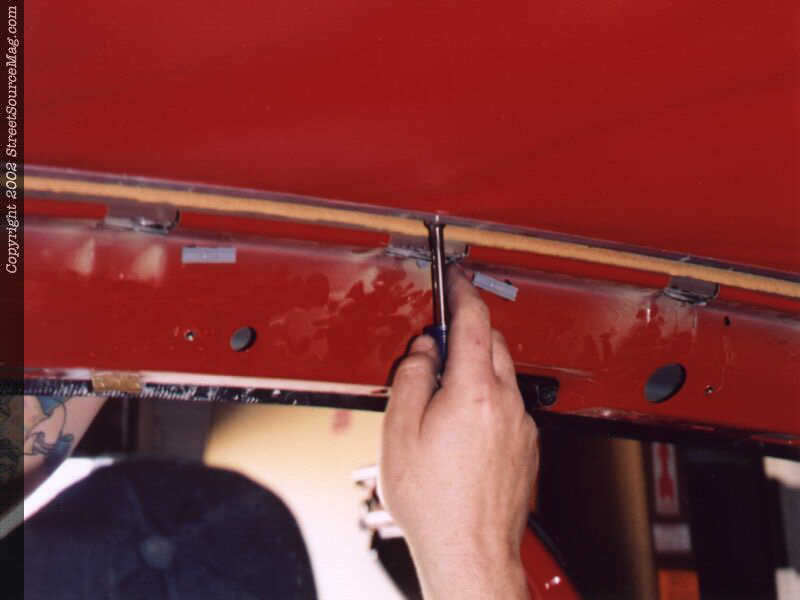 The frame is reinstalled and tightened down this time. Another inside view of the frame as it's reinstalled and tightened down. The headliner is then reinstalled loosely and the unused portion removed.